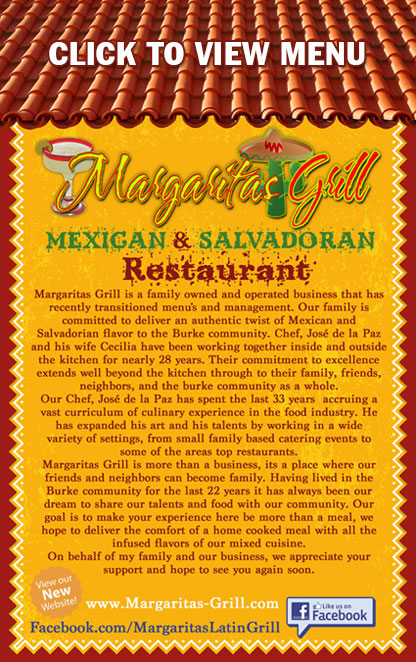 Margaritas Grill is a family owned and operated business that has recently transitioned menu's and management. Our family is committed to deliver an authentic twist of Mexican and Salvadorian flavor to the Burke community. Chef, Jose de la Paz and his wife Cecilia have been working together inside and outside the kitchen for nearly 28 years. Their commitment to excellence extends well beyond the kitchen through to their family, friends, neighbors, and the burke community as a whole. Our Chef, José de la Paz has spent the last 33 years accruing a vast curriculum of culinary experience in the food industry. He has expanded his art and his talents by working in a wide variety of settings, from small family based catering events to some of the areas top restaurants. Margaritas Grill is more than a business, its a place where our friends and neighbors can become family. Having lived in the Burke community for the last 22 years it has always been our dream to share our talents and food with our community. Our goal is to make your experience here be more than a meal, we hope to deliver the comfort of a home cooked meal with all the infused flavors of our mixed cuisine. On behalf of my family and our business, we appreciate your support and hope to see you again soon.